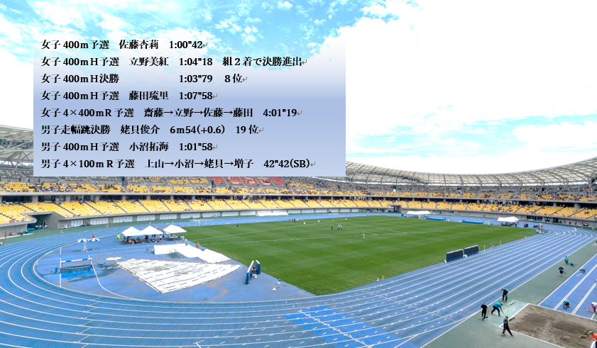 女子の400mHで決勝進出、男子の4×100mRで今のチームでのベストを更新する活躍を見せました。