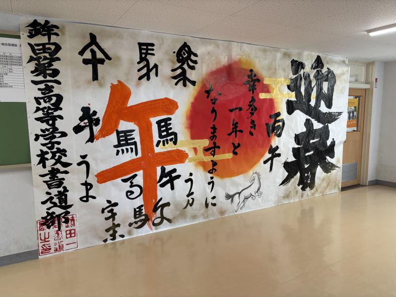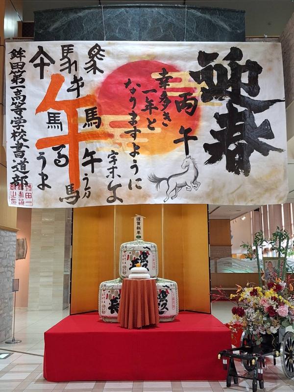 書道部がホテルレイクビュー水戸よりご依頼を受け、新年を祝う大作を制作しました。ホテルのエントランスに1月いっぱい掲示されています。また、同様の作品を校内昇降口にも展示しております。